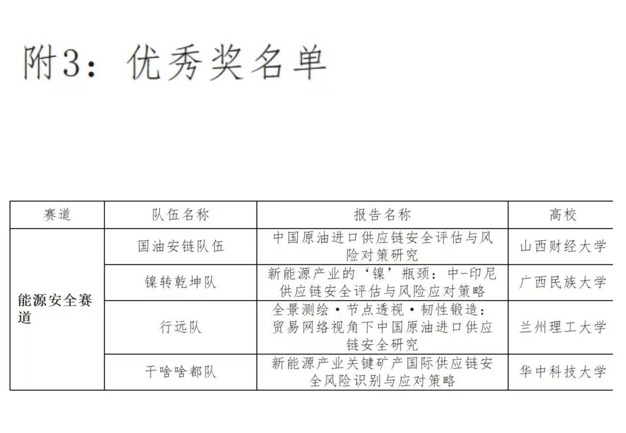 “国油安链队伍”(成员:朱露露、池敏敏、肖宛珊、姜丰、王晓然、卢家荣、但倩、李蕊、王紫薇、孙慧琳)凭借扎实的专业素养与出色的实践能力,在“能源安全”赛道脱颖而出,斩获全国优秀奖。