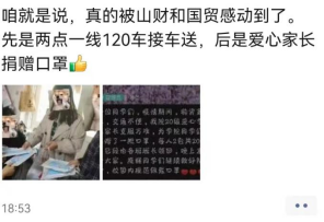 收到爱心口罩的同学们纷纷在朋友圈里晒出了这份温暖。2019级农林经济管理2班丁天宇同学写道“真是被山财和国贸感动到了”。2020级农林经济管理2班高嘉昕表示“收到爱心家长捐赠的两包口罩,我真切地感受到了关爱与呵护,不仅解决了我口罩紧缺的问题,更让我多了一份安全感。”2021级国际商务班司卓雅表示“感谢爱心家长在困难的时候伸出援助之手,我坚信在我们的共同努力下,终将战胜疫情,我也会努力学习,报答社会,报效祖国!”