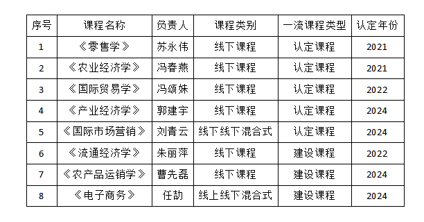 4门课程获得山西省一流课程立项,分别是:郭建宇负责的《产业经济学》(线下,认定课程);刘青云负责的《国际市场营销》|(线上线下混合式,认定课程);曹先磊负责的《农产品运销学》(线下,建设课程);任劼负责的《电子商务》(线上线下混合式,建设课程)。